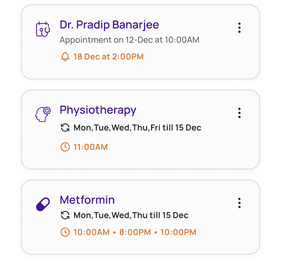 Set reminders for medicines, check-ups, vaccines, or insurance renewals — for anyone in your family.